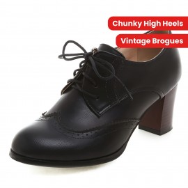 Sapatos Oxford de salto alto grosso para mulheres com amarração, estilo brogue, moda casual, salto grosso e bico de asa