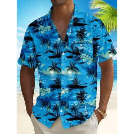 Camisa masculina havaiana com flores azuis, camisa casual de verão unissex para férias na praia, de manga curta e estampada com elementos florais e plantas tropicais