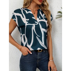 Blusa de gola V a rayas com bloco de cor, blusa elegante de manga curta para a primavera e o verão, roupa de mulher