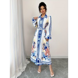 Vestido A-line com botões na frente estampado floral, vestido casual de manga curta para primavera e verão, roupas femininas