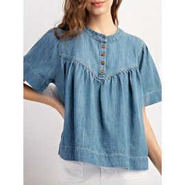 Camiseta de Denim Vintage Feminina - Top Sem Mangas com Decote em V e Botões, 300gsm Algodão Elástico, Lavável na Máquina para Uso Casual em Todas as Estações